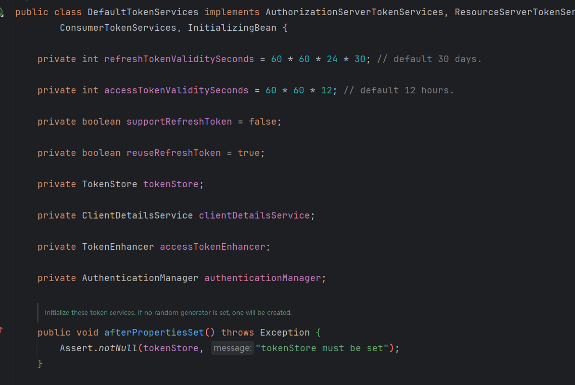 使用随机UUID值作为访问令牌和刷新令牌值的令牌服务的基本实现。自定义的主要扩展点是 TokenEnhancer,它将在生成访问和刷新令牌后但在存储之前被调用。持久性委托给 TokenStore实现,并将访问令牌定制给 TokenEnhancer。